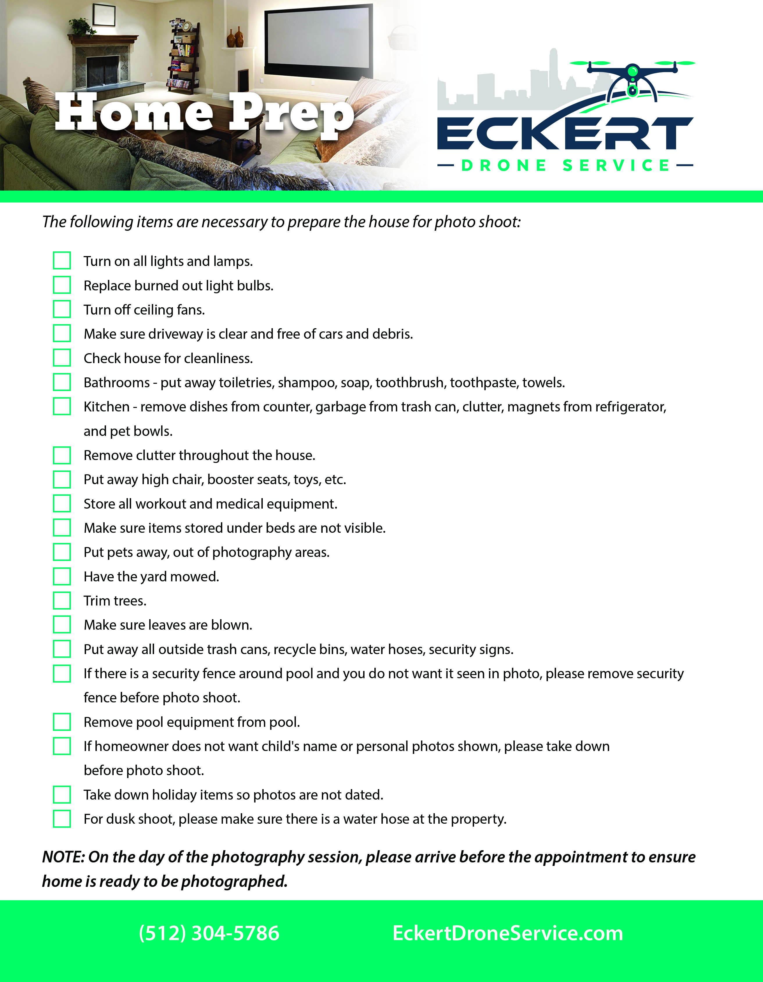 After setting an appointment with Eckert Drone Service, please review the home preparation flyer to ensure your property is ready for the photo shoot. Here you will see all those requirements for photography